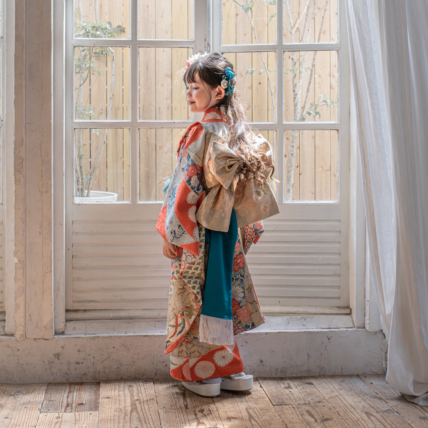 ヴィンテージの正絹着物を丁寧に仕立て直し、伝統とモダンを融合させた一点物の七五三衣装。