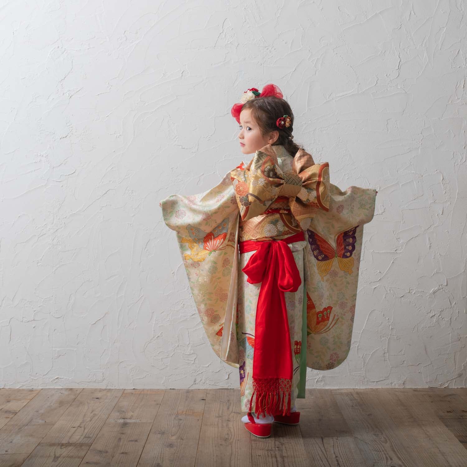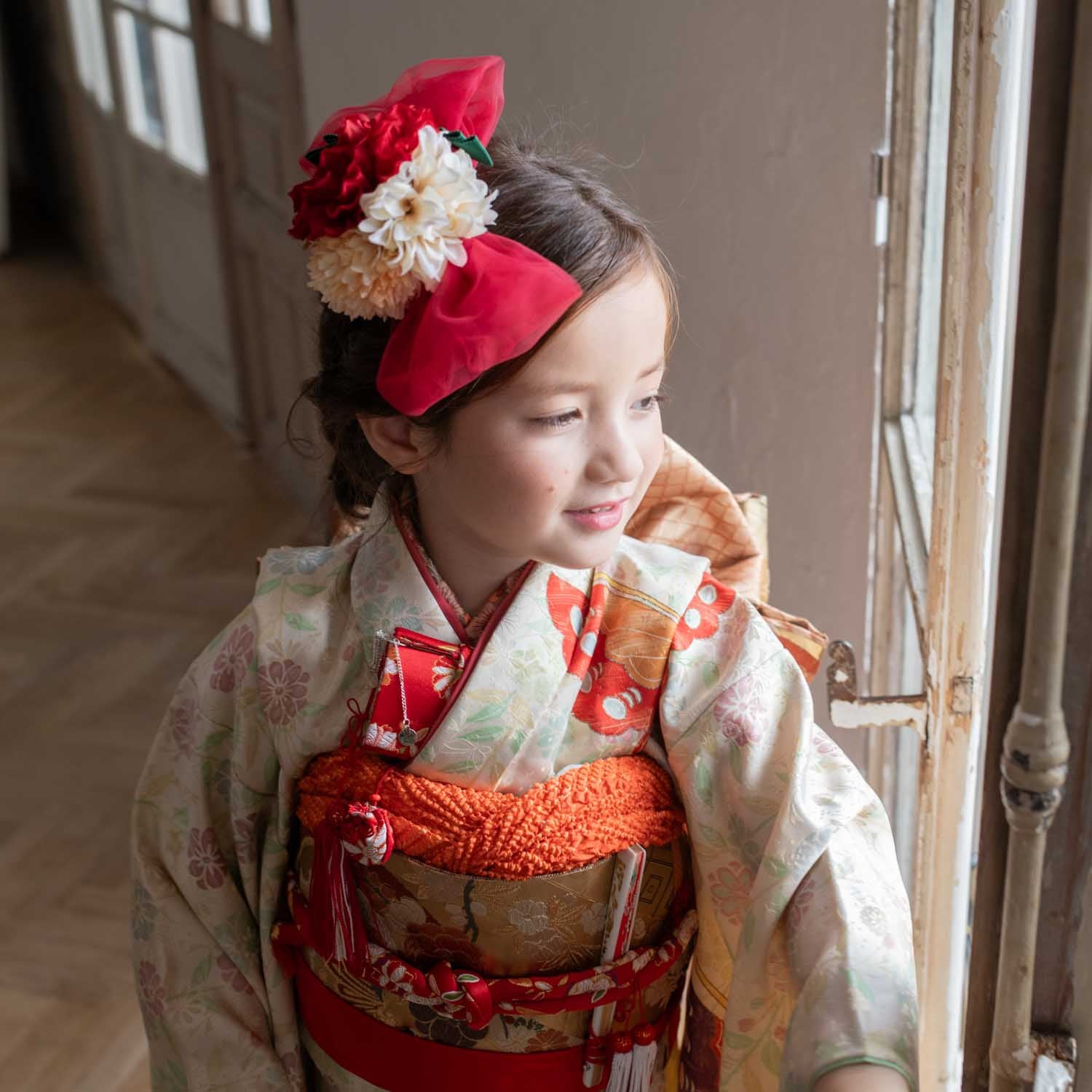 しごきやバッグなど、小物を赤色でまとめて七五三らしい華やかな装いに仕上げました。