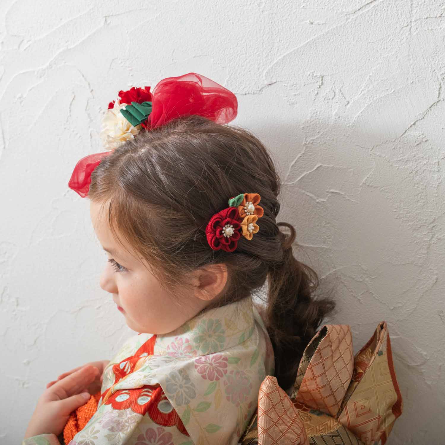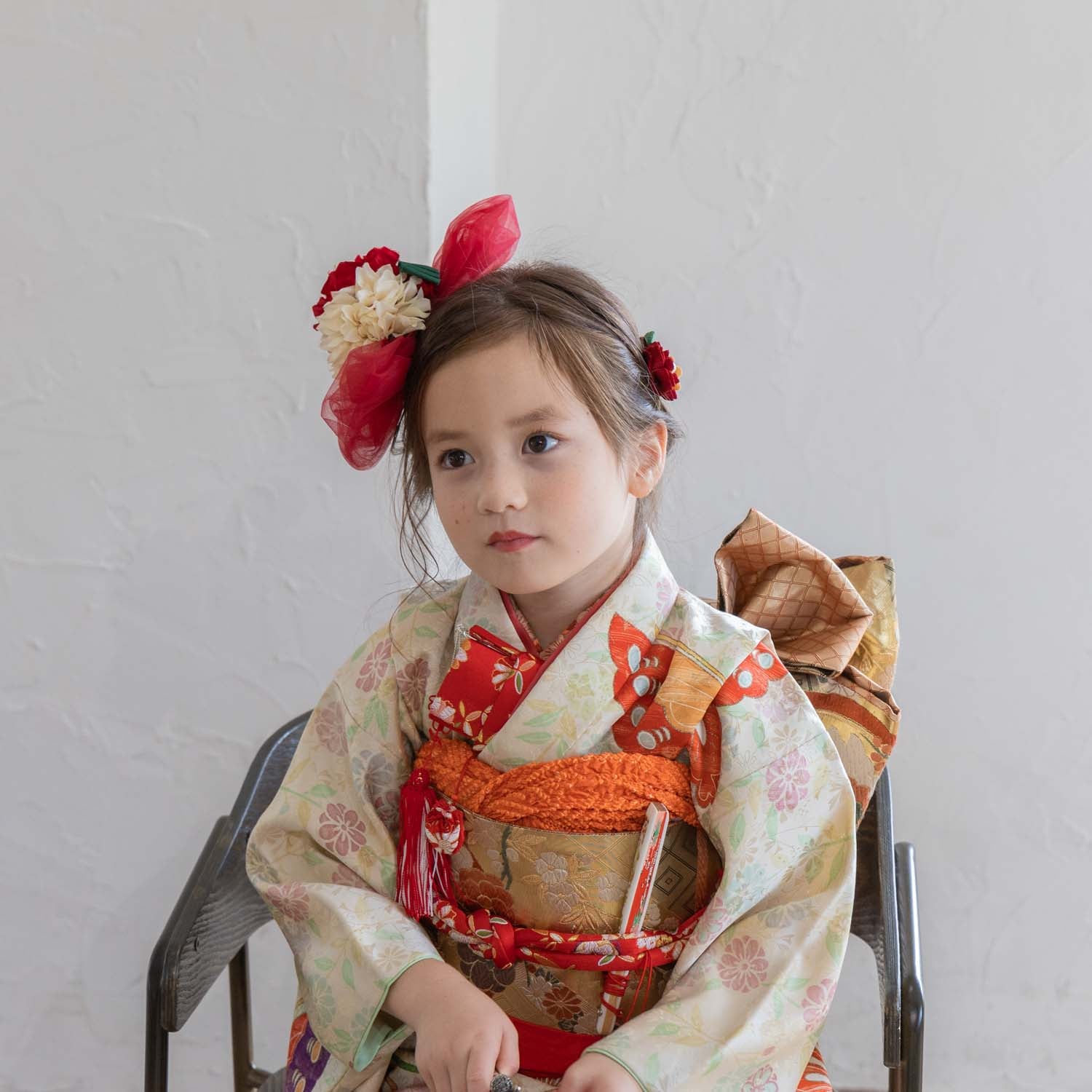 着物に合わせてデザインされた1点物の髪飾りは、華やかさと使いやすさを兼ね備えており、軽いのでお子様も快適にお使いいただけます。