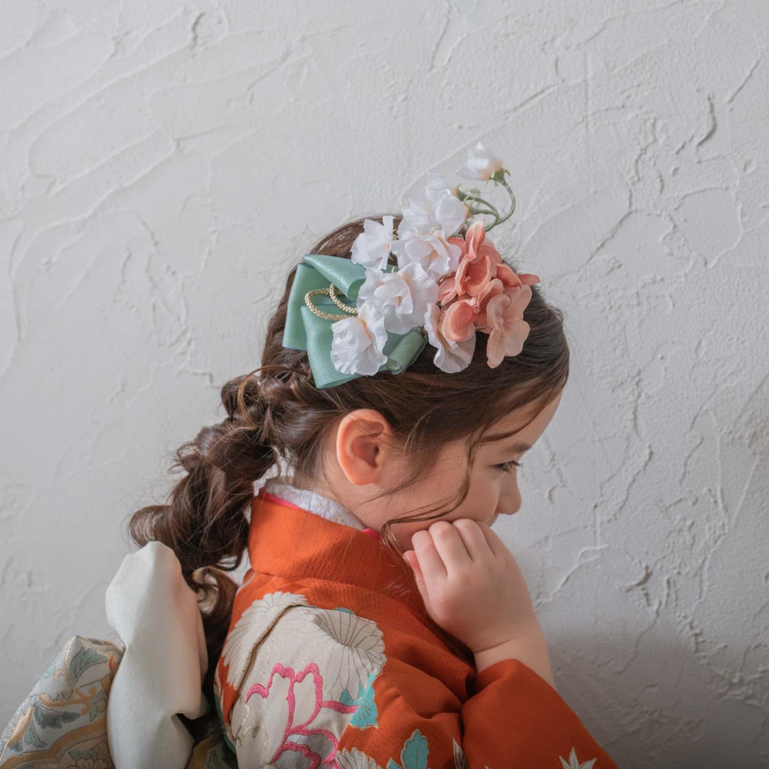 着物に合わせてデザインされた1点物の髪飾りは、華やかさと使いやすさを兼ね備えており、軽いのでお子様も快適にお使いいただけます。