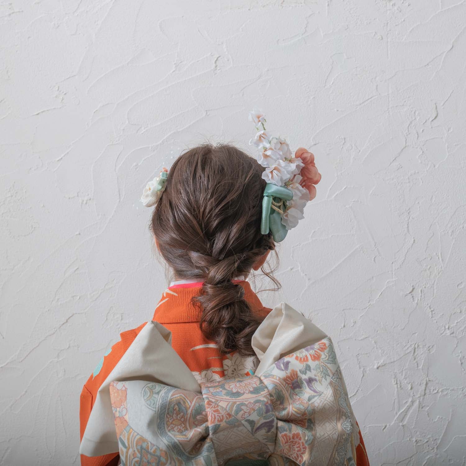 オリジナルのチュールしごきなど、小物類はミントグリーンでまとめて爽やかな雰囲気に仕上げています。