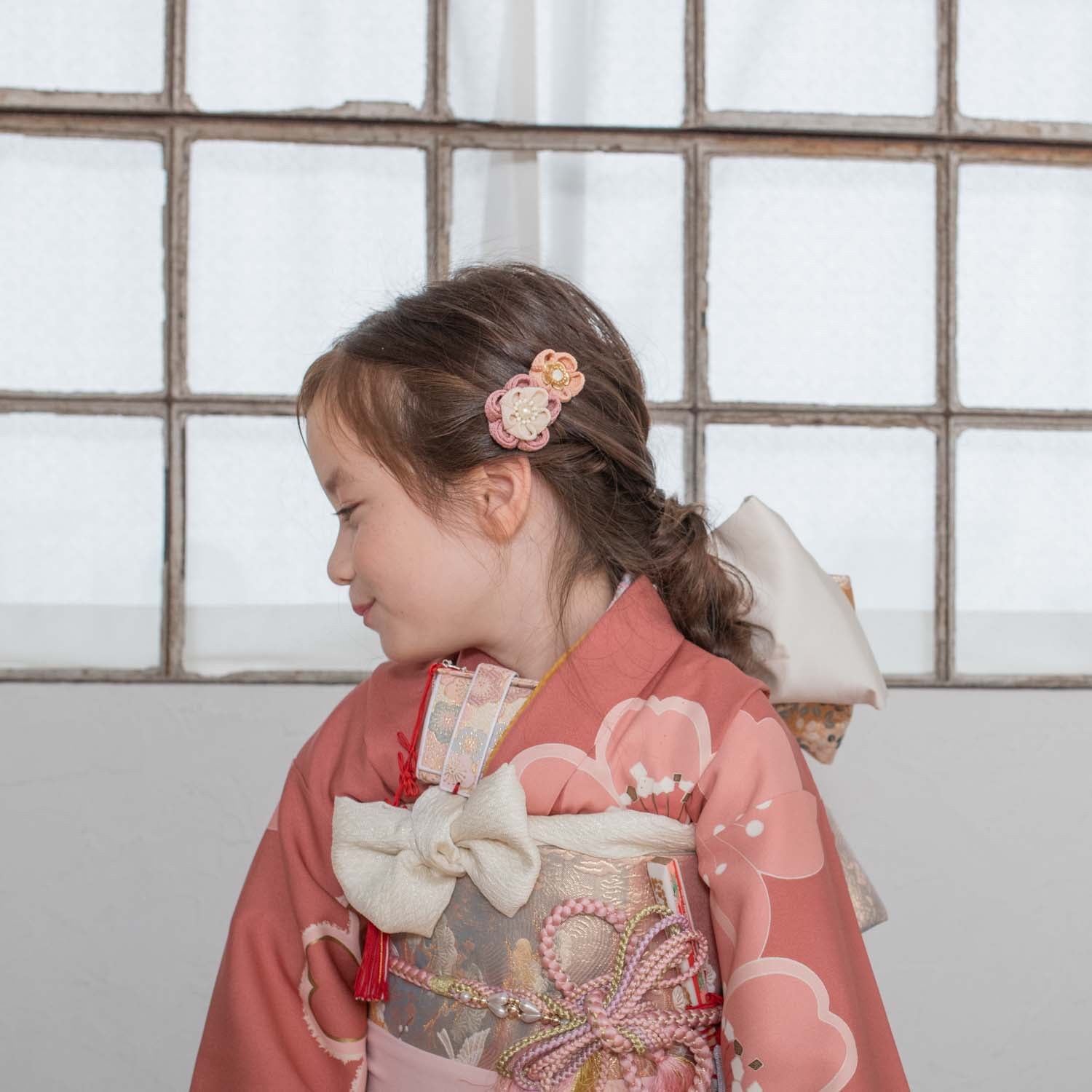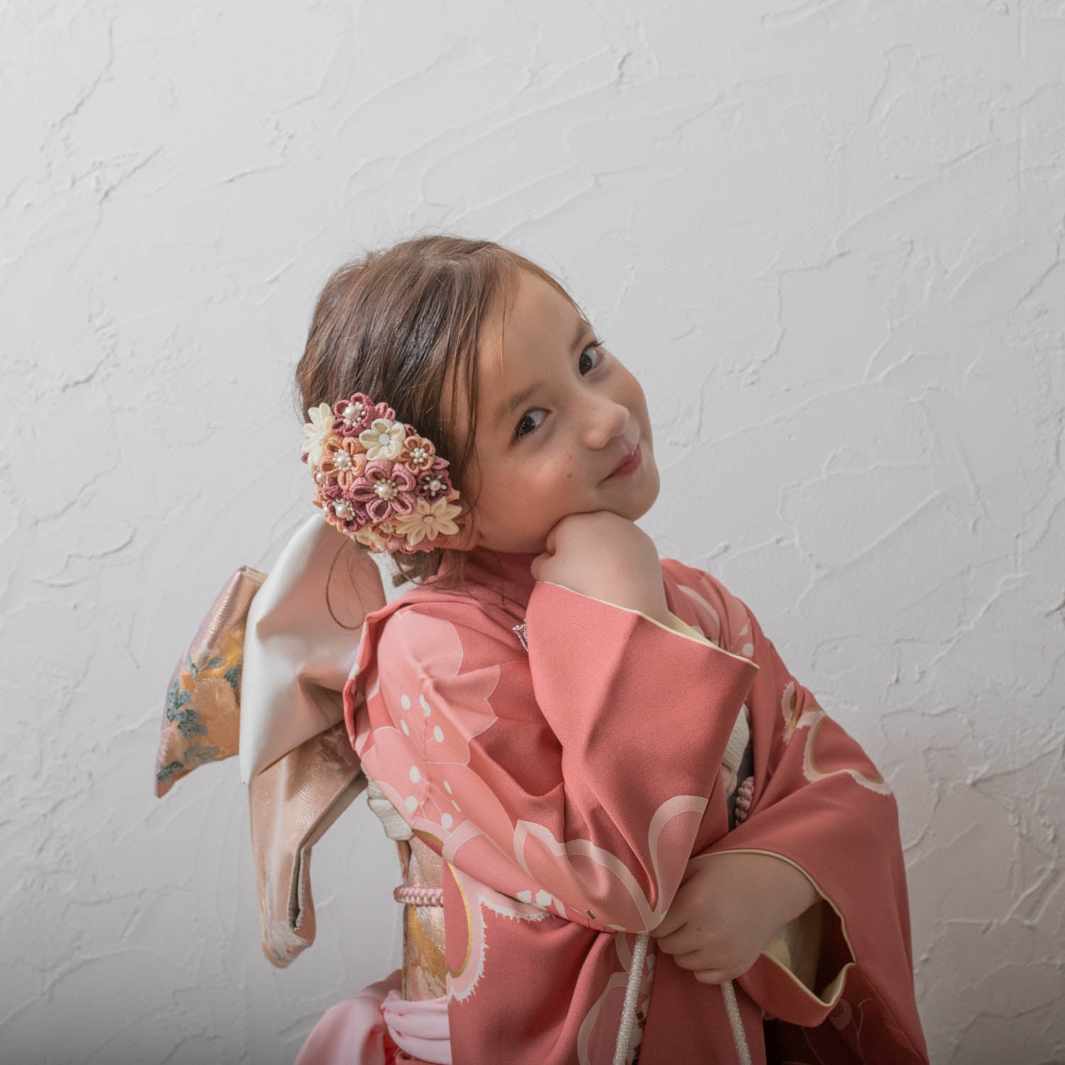 着物に合わせてデザインされた1点物の髪飾りは、華やかさと使いやすさを兼ね備えており、軽いのでお子様も快適にお使いいただけます。