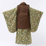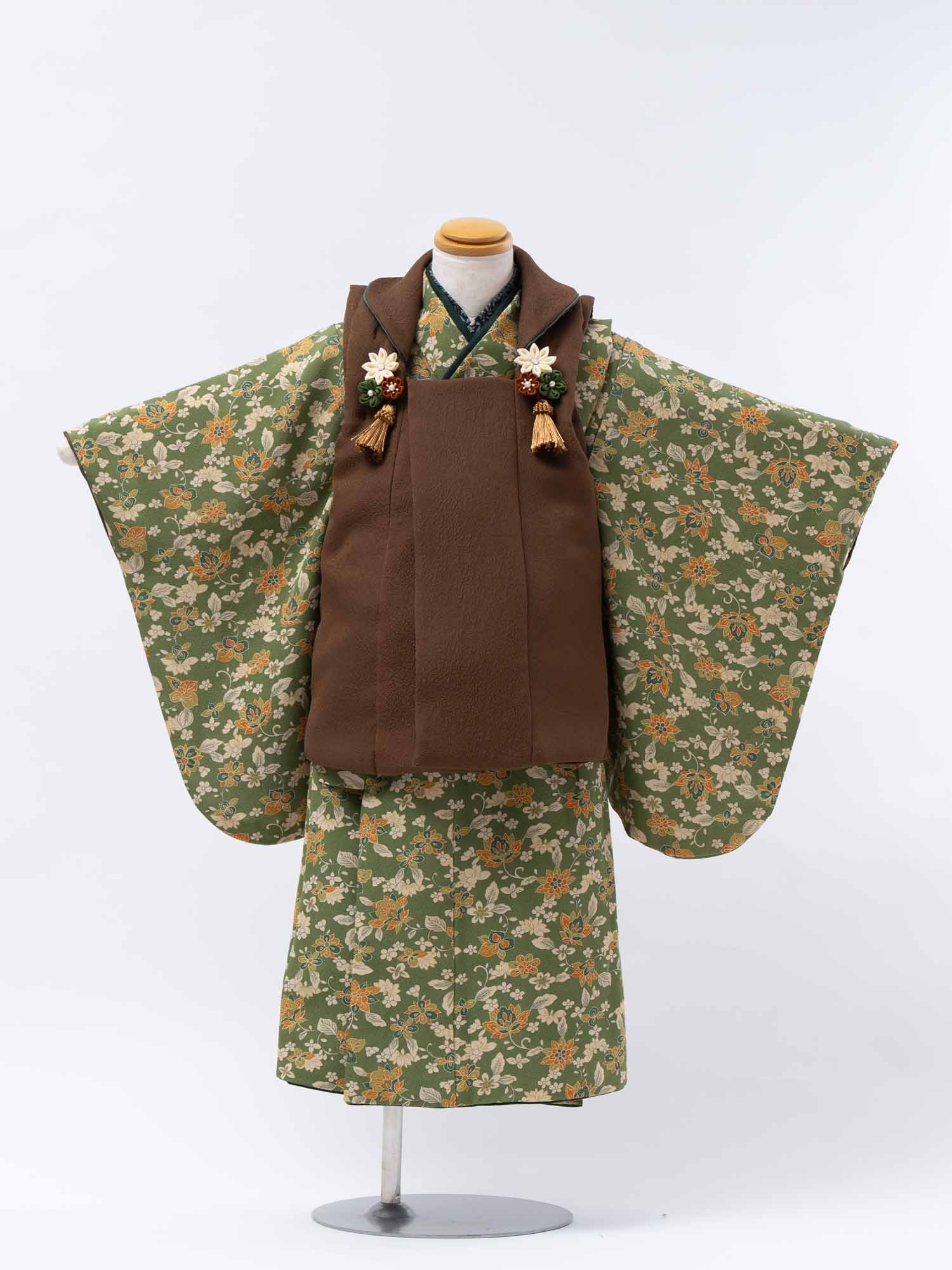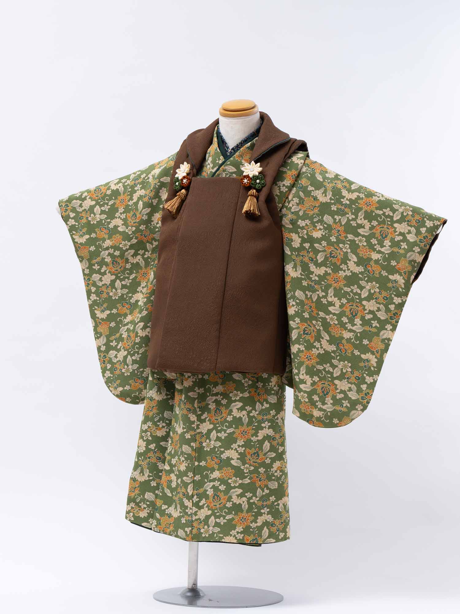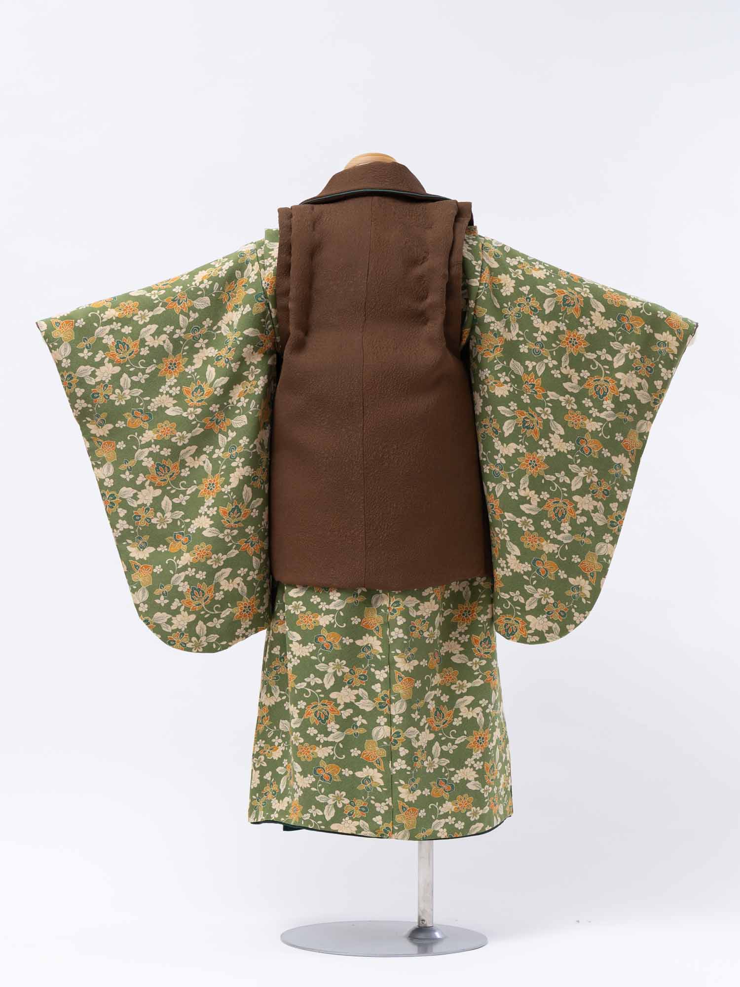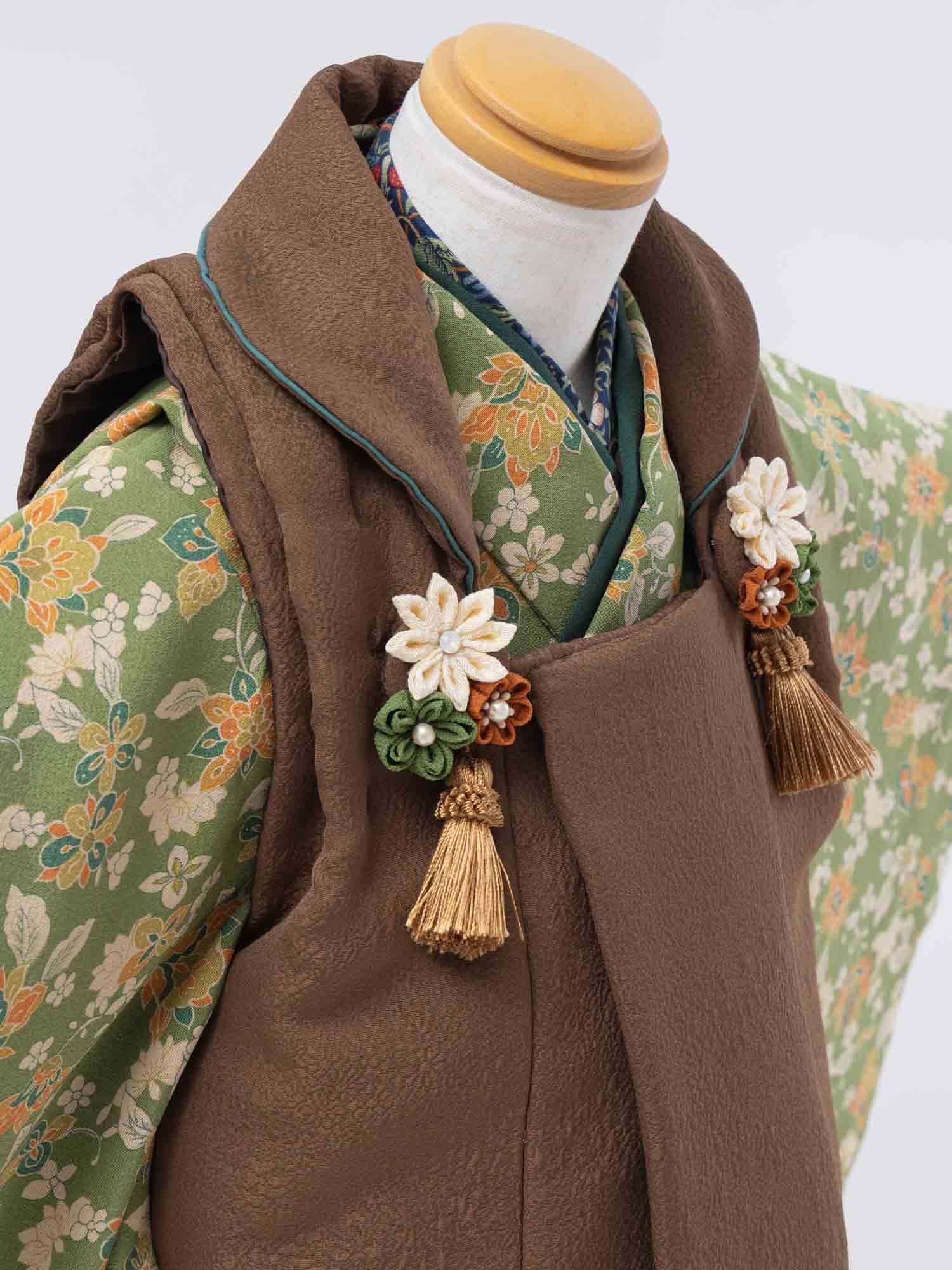 明るい抹茶色の着物に可憐な小花柄をあしらい、深みのある茶色の被布を合わせた上品なコーディネート。