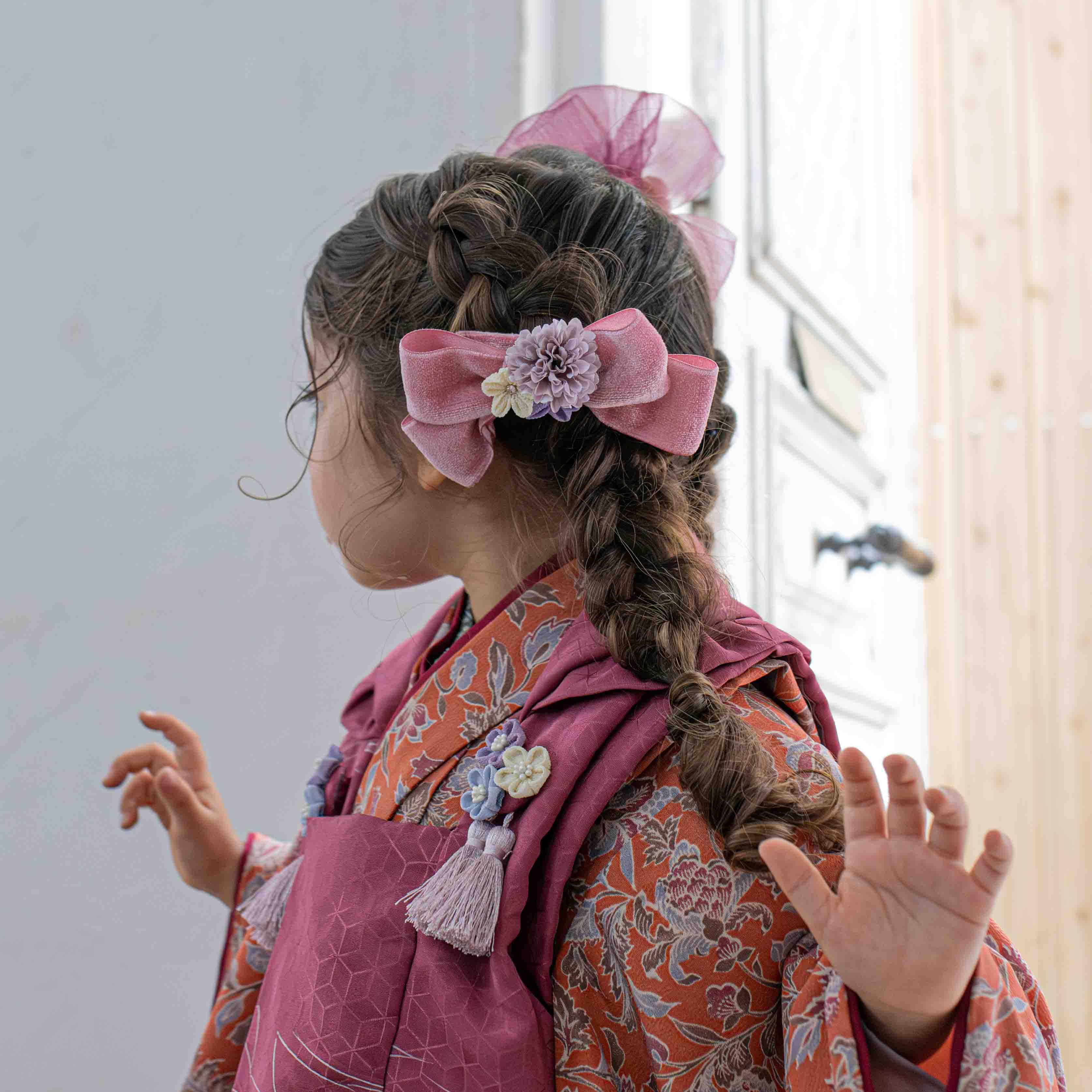 紫寄りのピンク色の被布は、背中の大きなリボンがポイント。