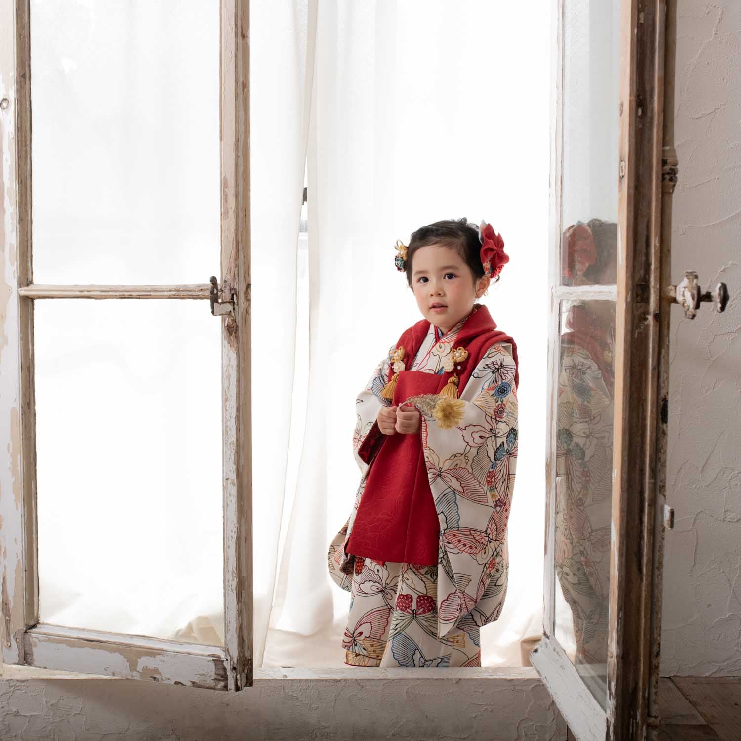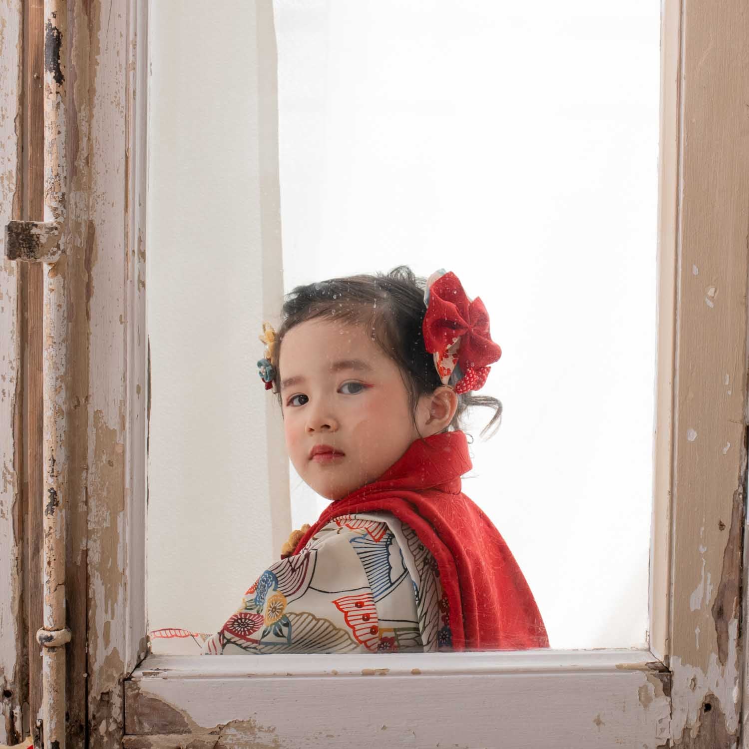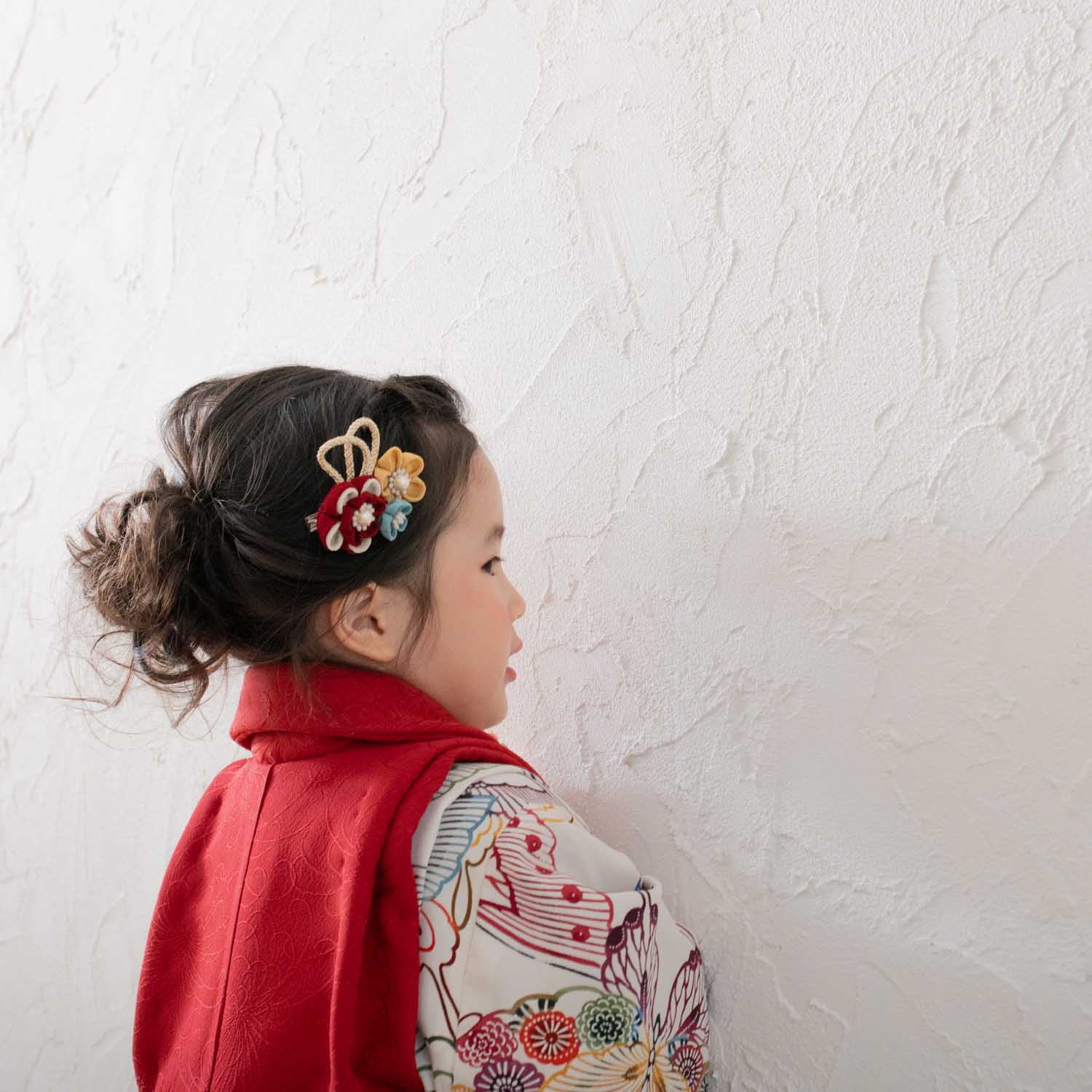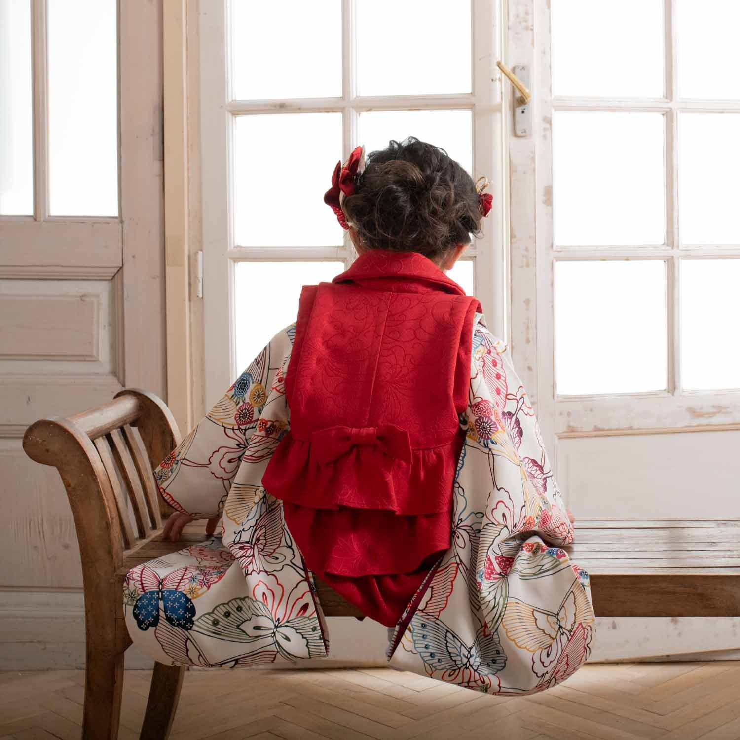 鮮やかな赤色の被布をあわせ、七五三らしい華やかな装いに。