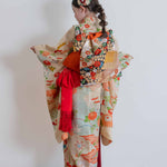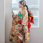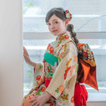 生成色の地に、水色やピンクの差し色がやさしく映えるデザイン。赤やピンクの花が散りばめられ、可愛らしさと上品さを兼ね備えています。