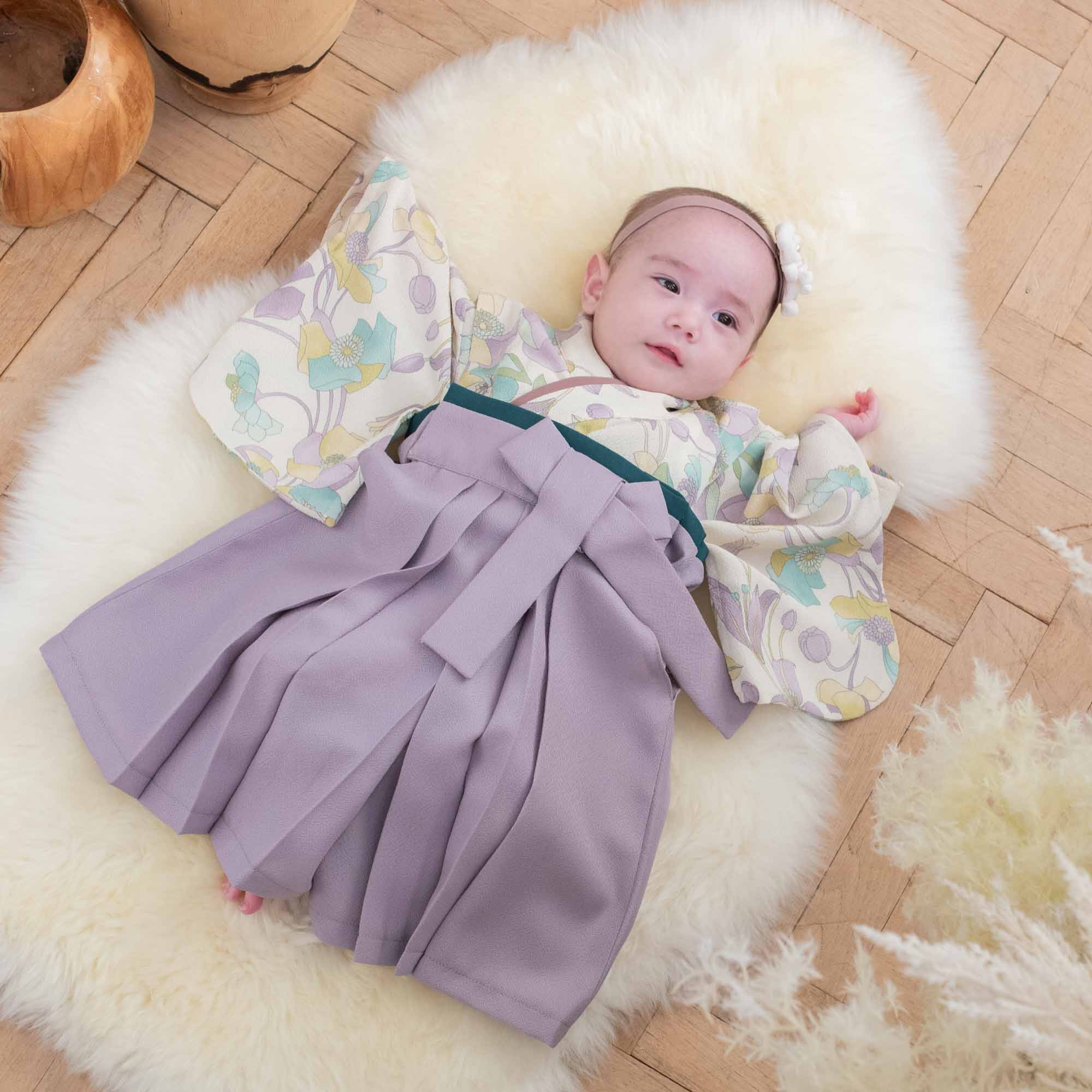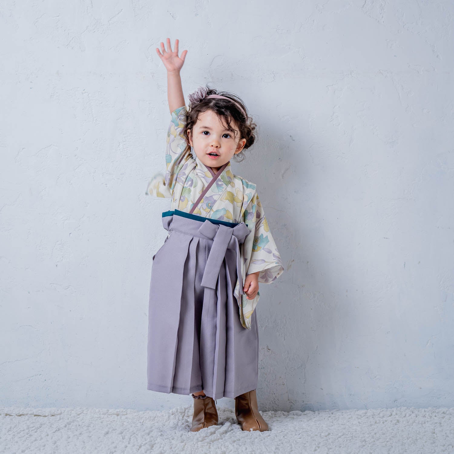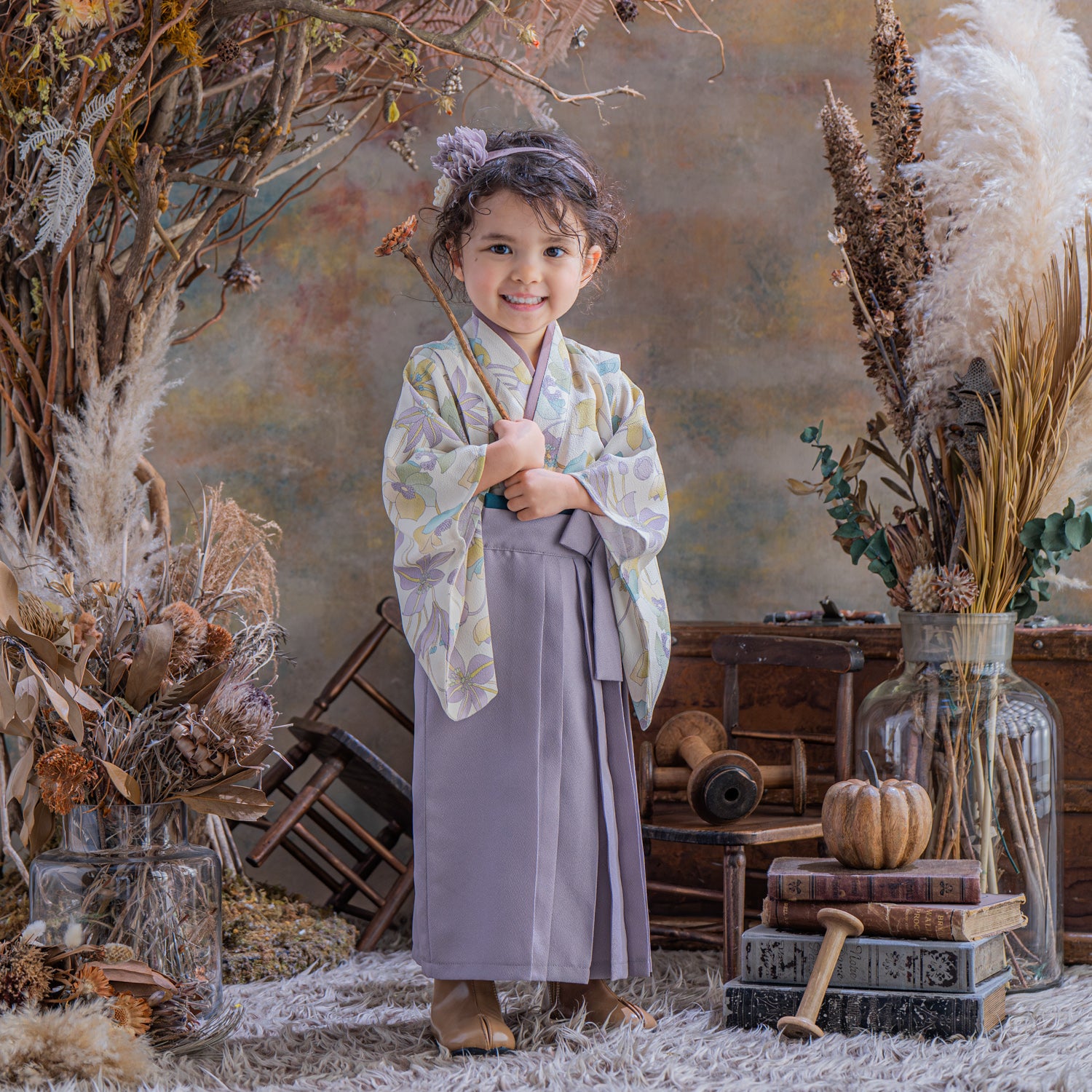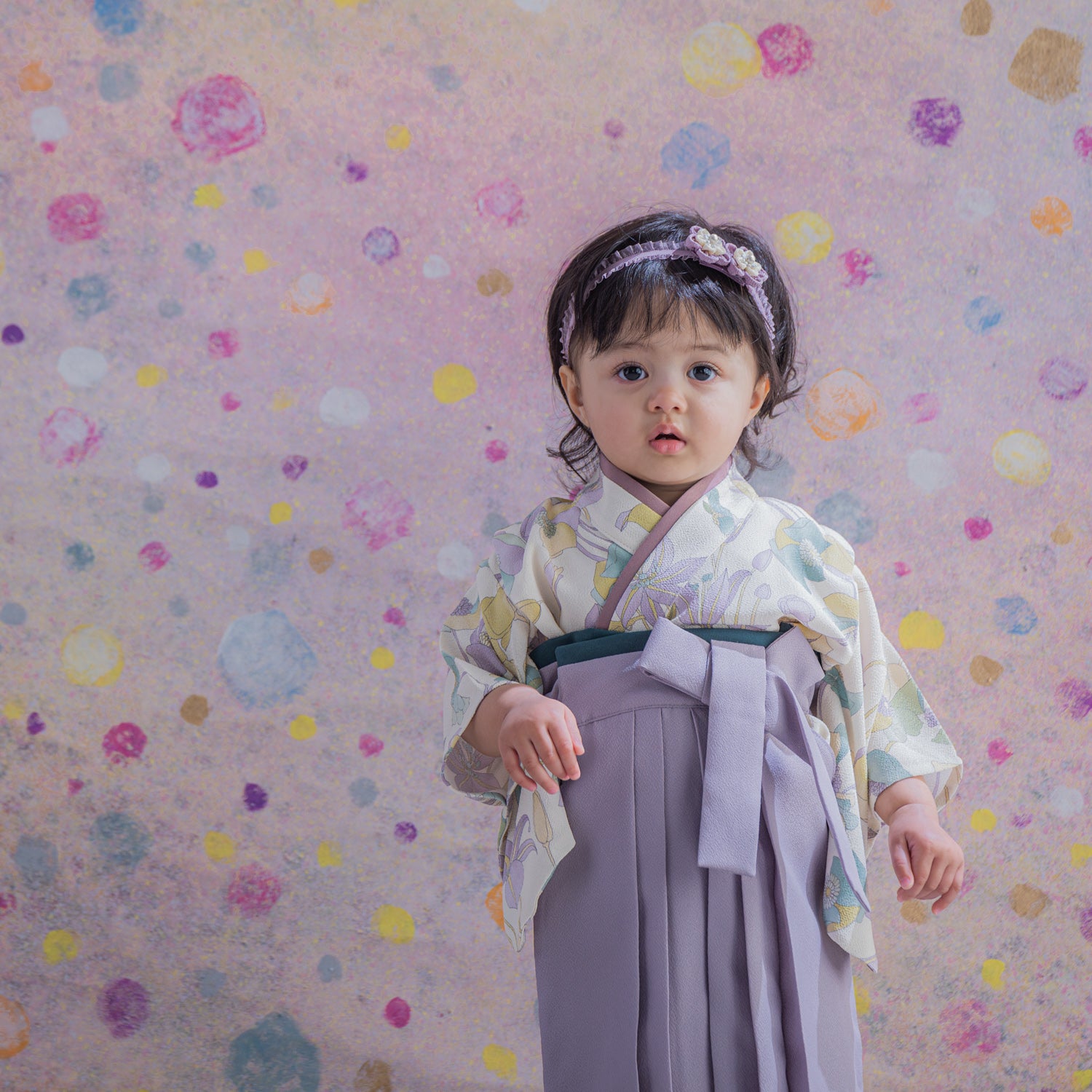 ラベンダー色の袴を合わせ、可愛らしさが残るシックで上品な一着です。