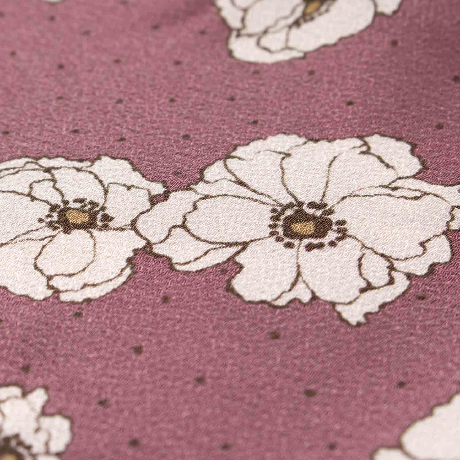 ダークピンクの落ち着いたトーンをベースに、レトロな雰囲気とモダンなデザインが調和した一着。薔薇(しょうび)の花言葉は「美」「愛」。いつもまでも愛される願いを込めてデザインしました。 ※柄の出方には個体差があります。 国産の「二越ちりめん」生地は、やわらかく適度な張りがあり、シワになりにくく肌離れの良い素材です。