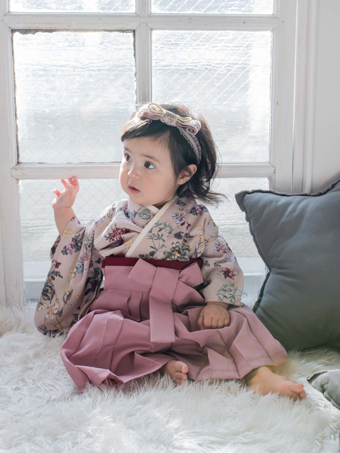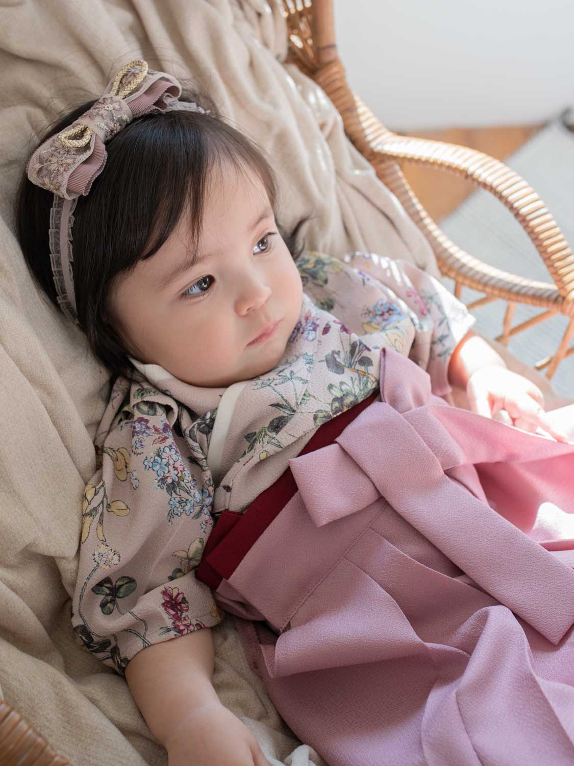 お食い初めの100日前後の時期には、胸のすぐ下あたりに袴がくるように履かせてあげることが綺麗に着付けができるポイントです。