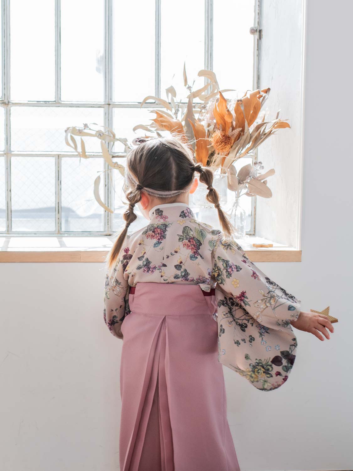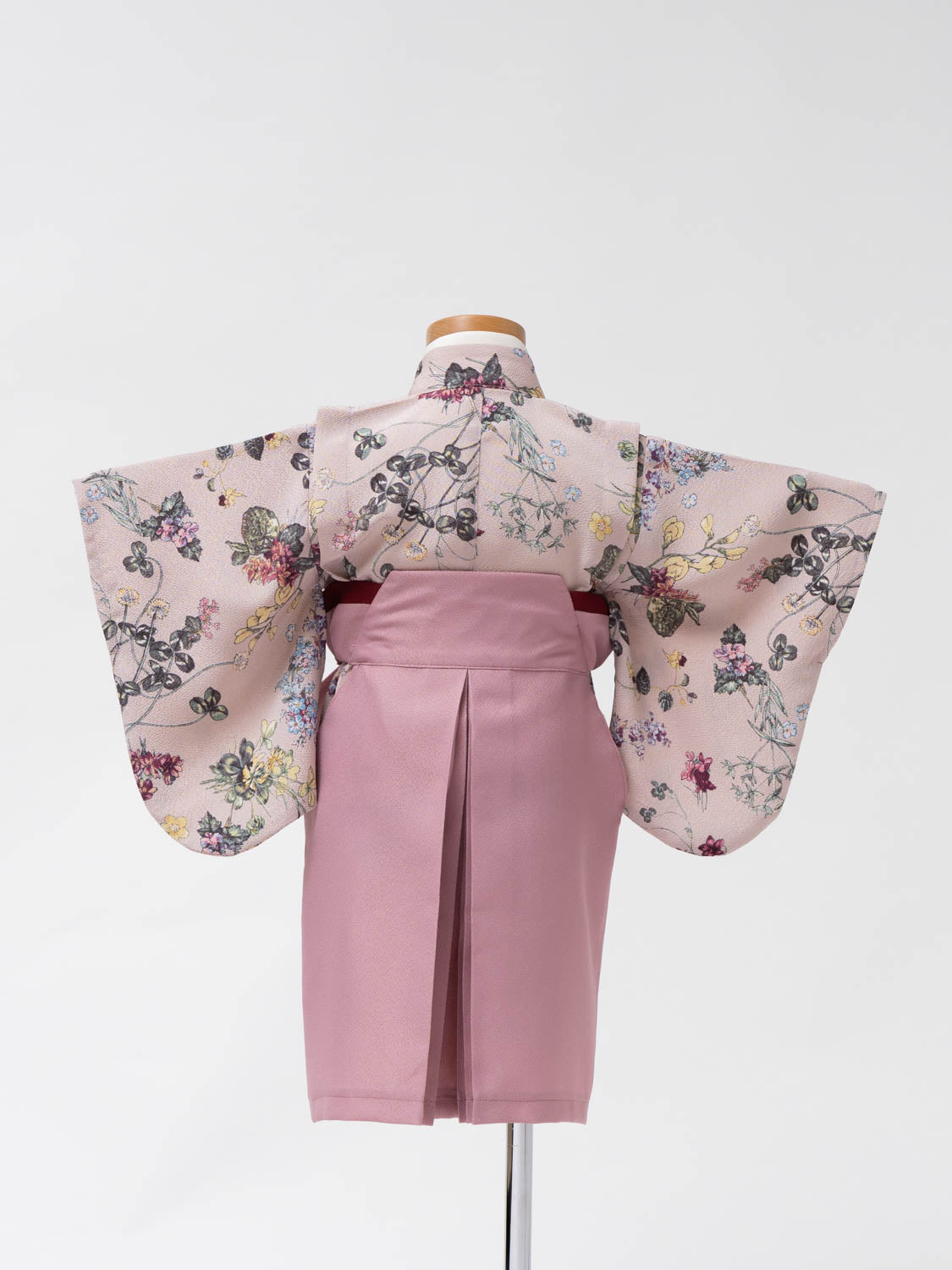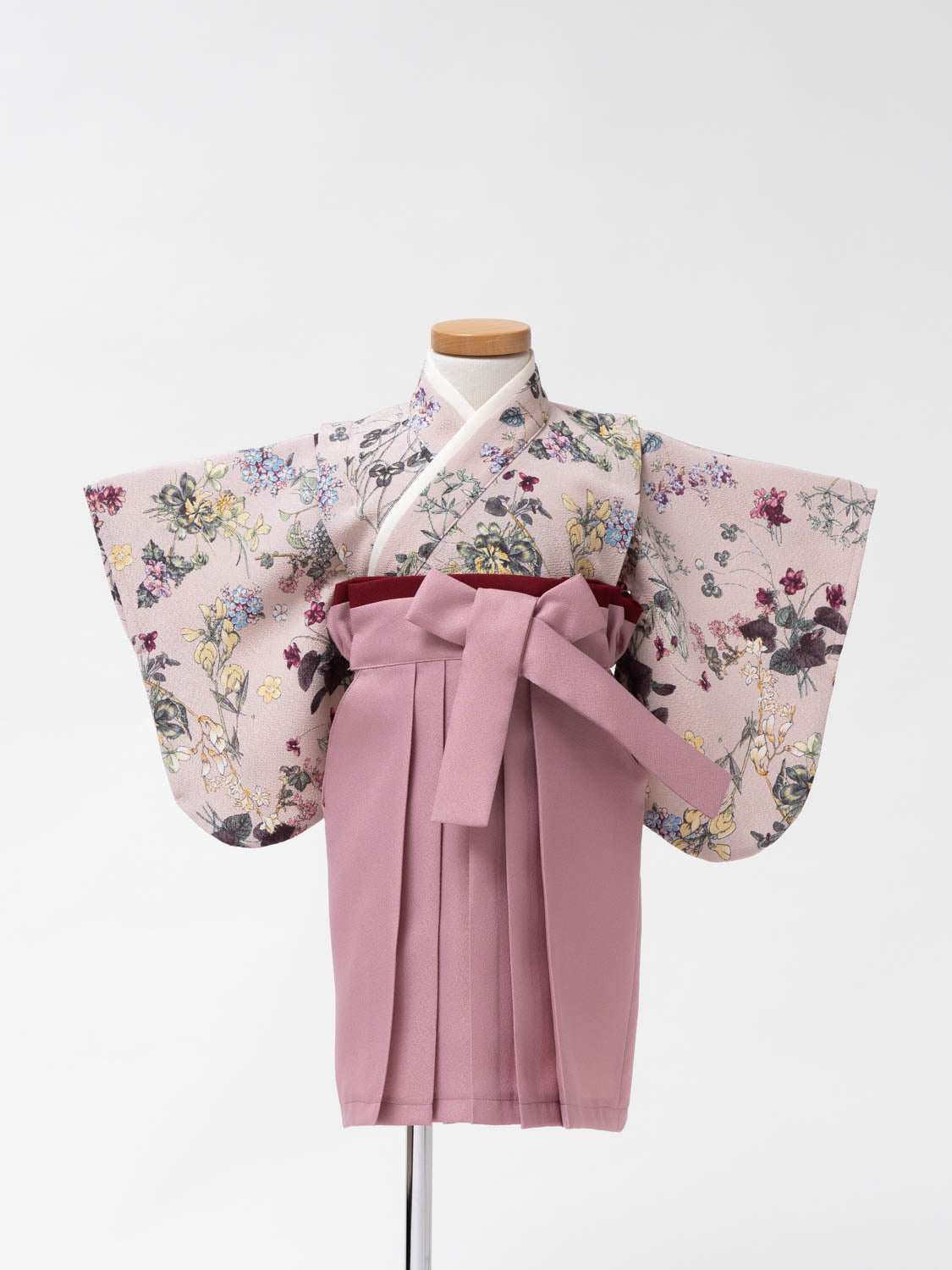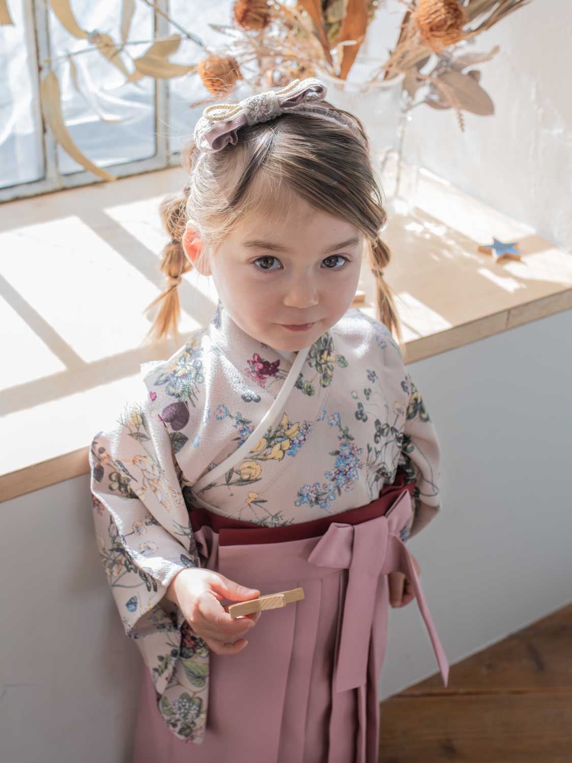 青みがかったくすみピンクをベースに、クローバーや色とりどりの草花が描かれたデザイン。 四葉のクローバーのように、お子様の未来にたくさんの幸福が訪れることを願い名づけました。 可愛らしく心温まるデザインで、特別な日の装いにぴったりです。 ※柄の出方には個体差があります。 国産の「二越ちりめん」生地は、やわらかく適度な張りがあり、シワになりにくく肌離れの良い素材です。