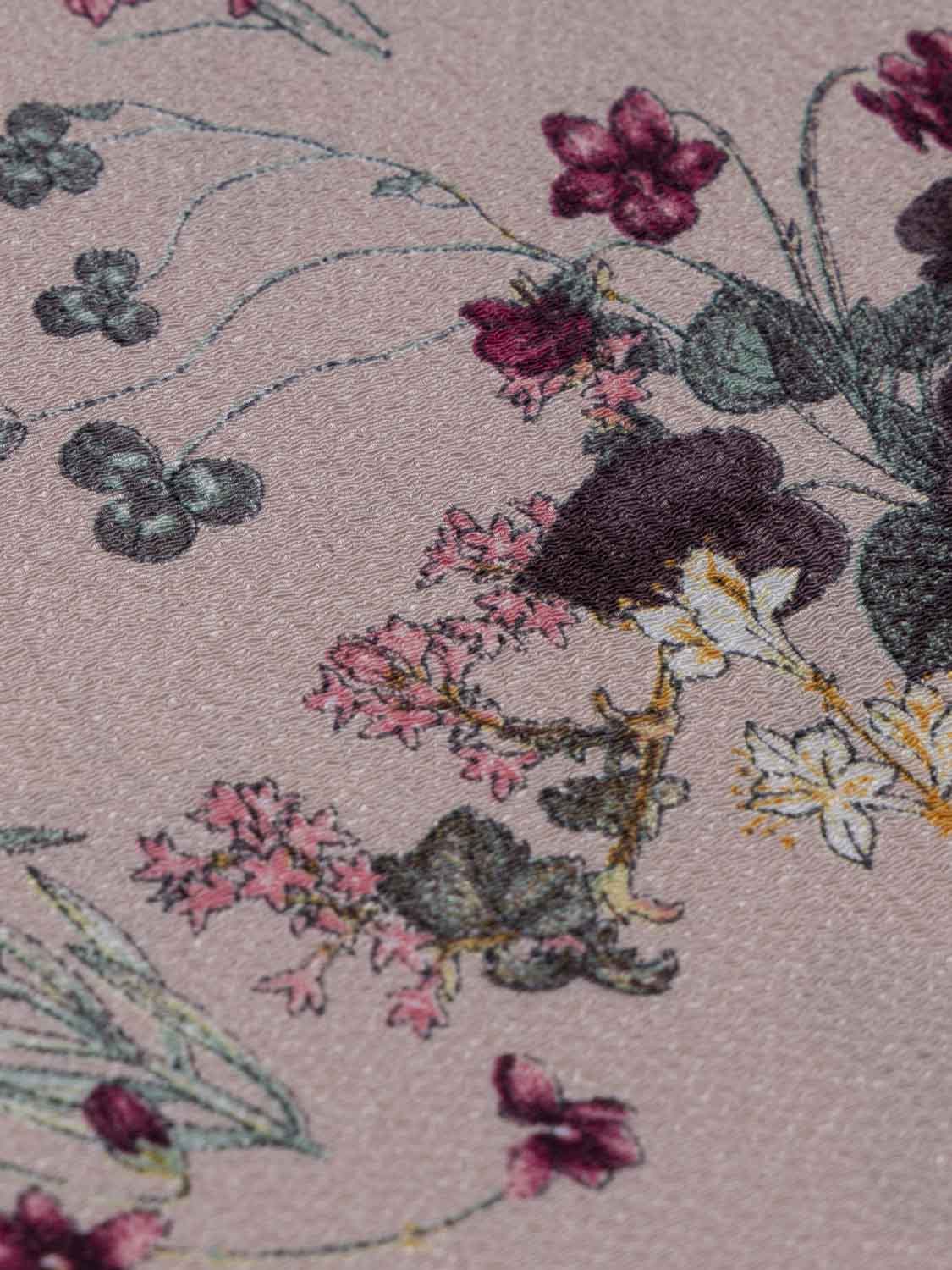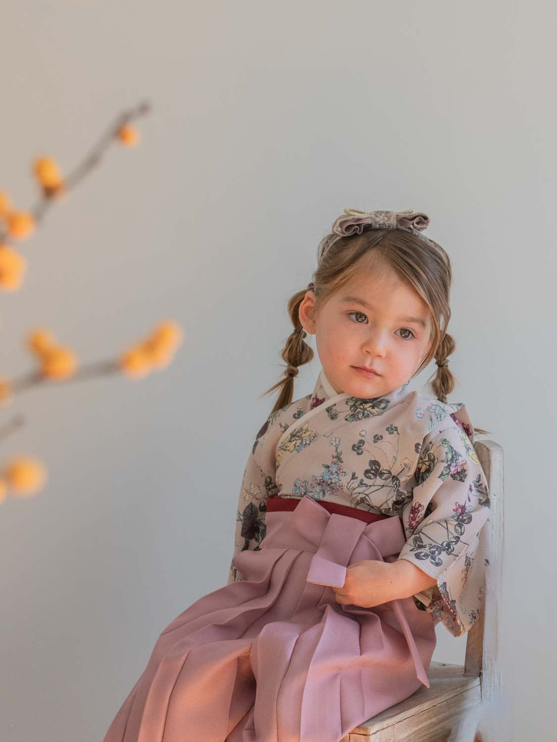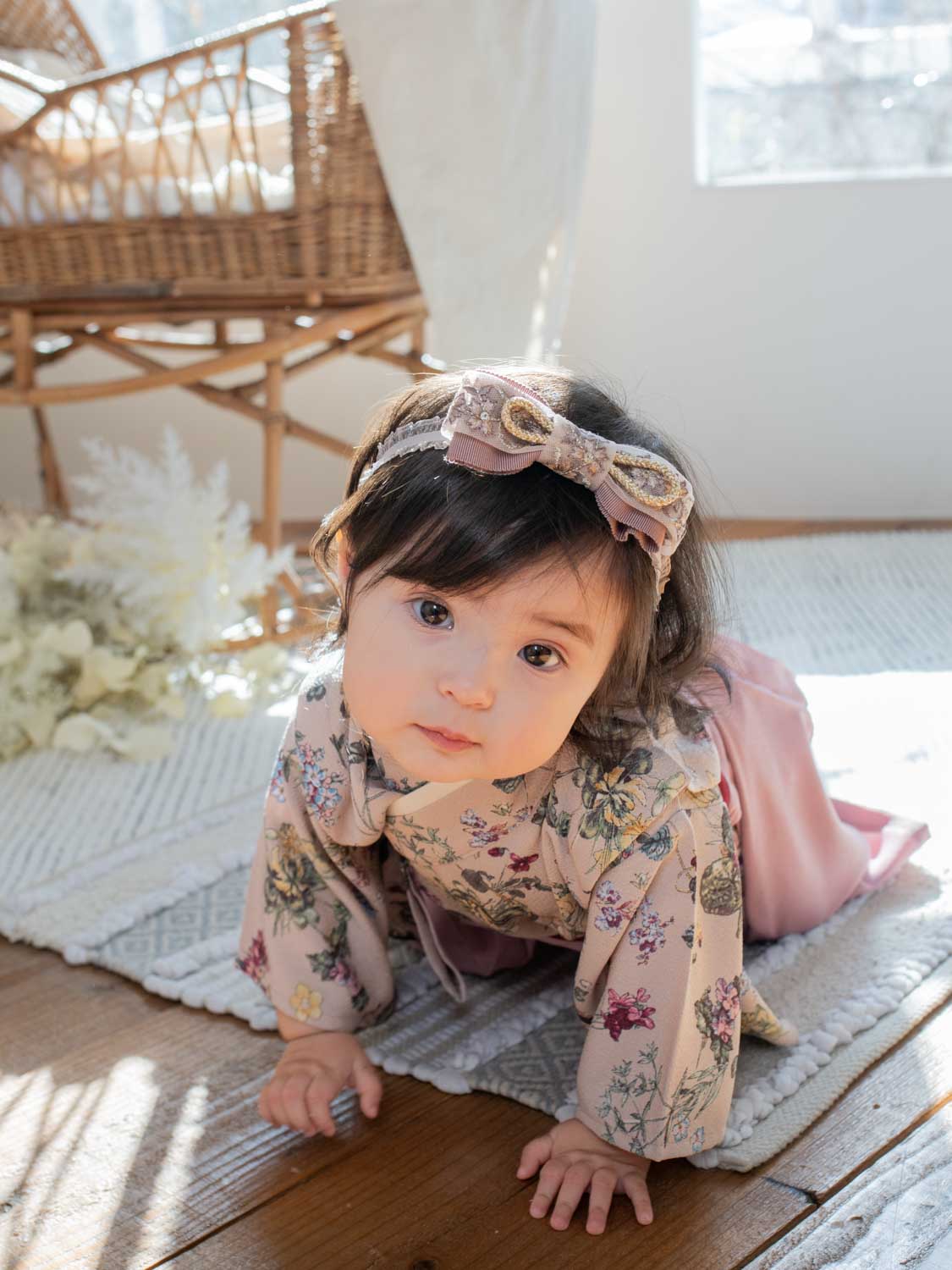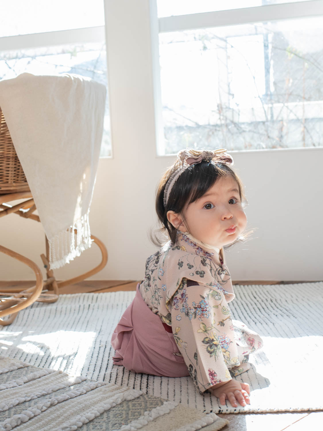 青みがかったくすみピンクをベースに、クローバーや色とりどりの草花が描かれたデザイン。 四葉のクローバーのように、お子様の未来にたくさんの幸福が訪れることを願い名づけました。 可愛らしく心温まるデザインで、特別な日の装いにぴったりです。 ※柄の出方には個体差があります。 国産の「二越ちりめん」生地は、やわらかく適度な張りがあり、シワになりにくく肌離れの良い素材です。