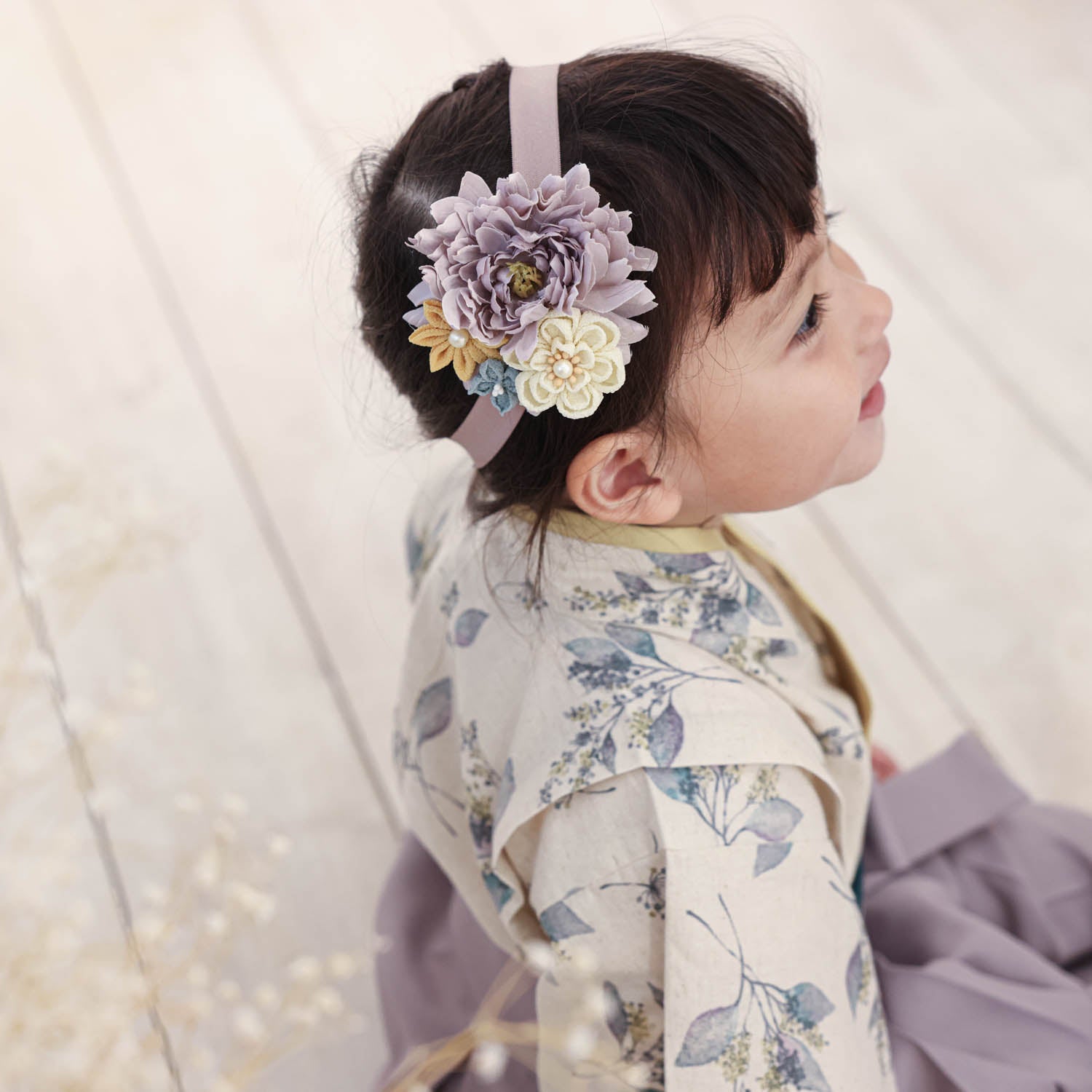 This hair band features a large dahlia flower decorated with three knob-shaped flowers.