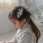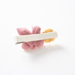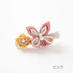 A hair clip decorated with cute tsumami zaiku butterflies and round flowers.