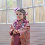 This unique Shichi-Go-San outfit is made by re-tailoring a vintage silk kimono to fit a child, combining traditional and modern elements.