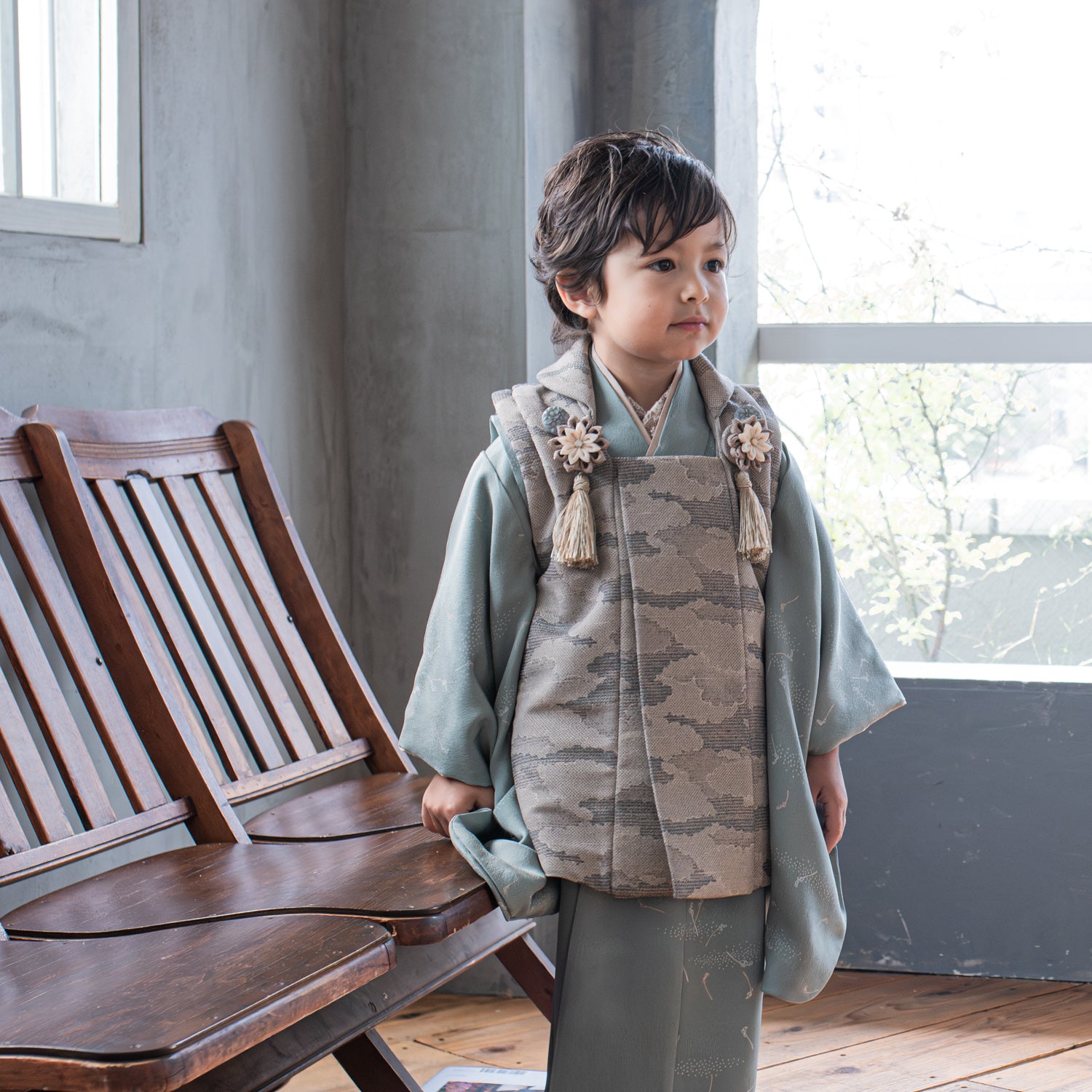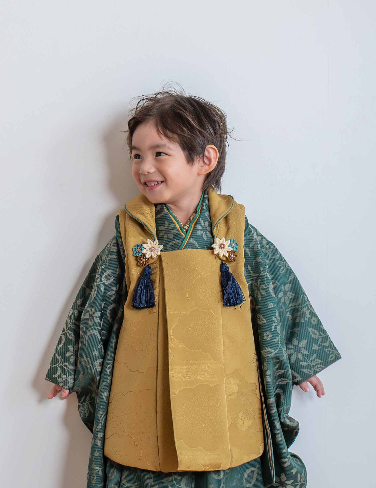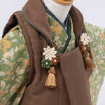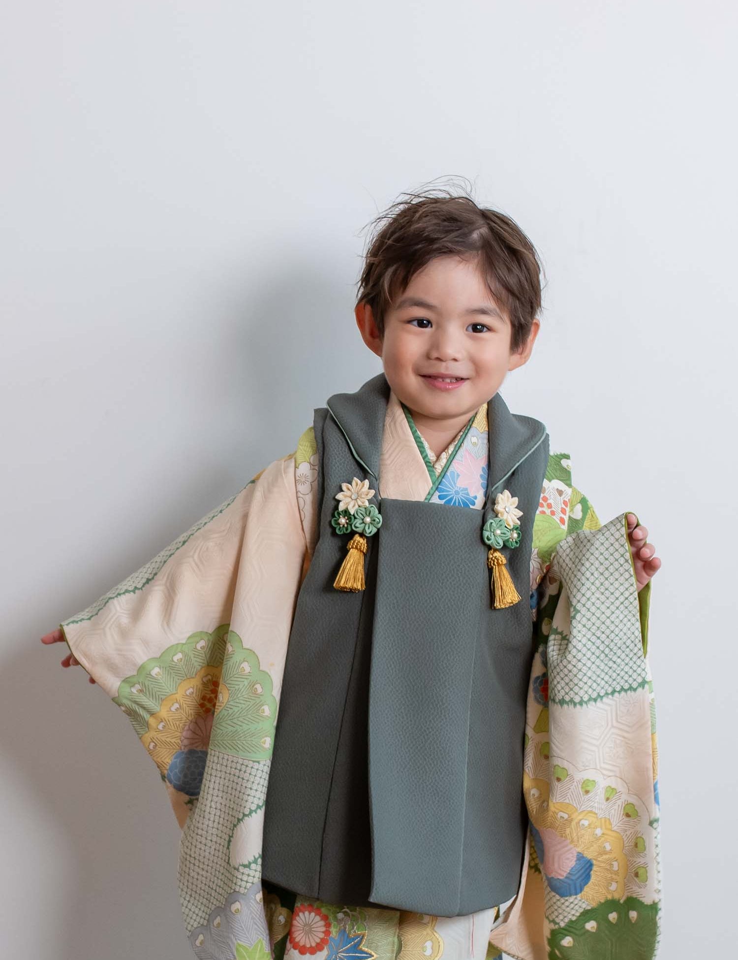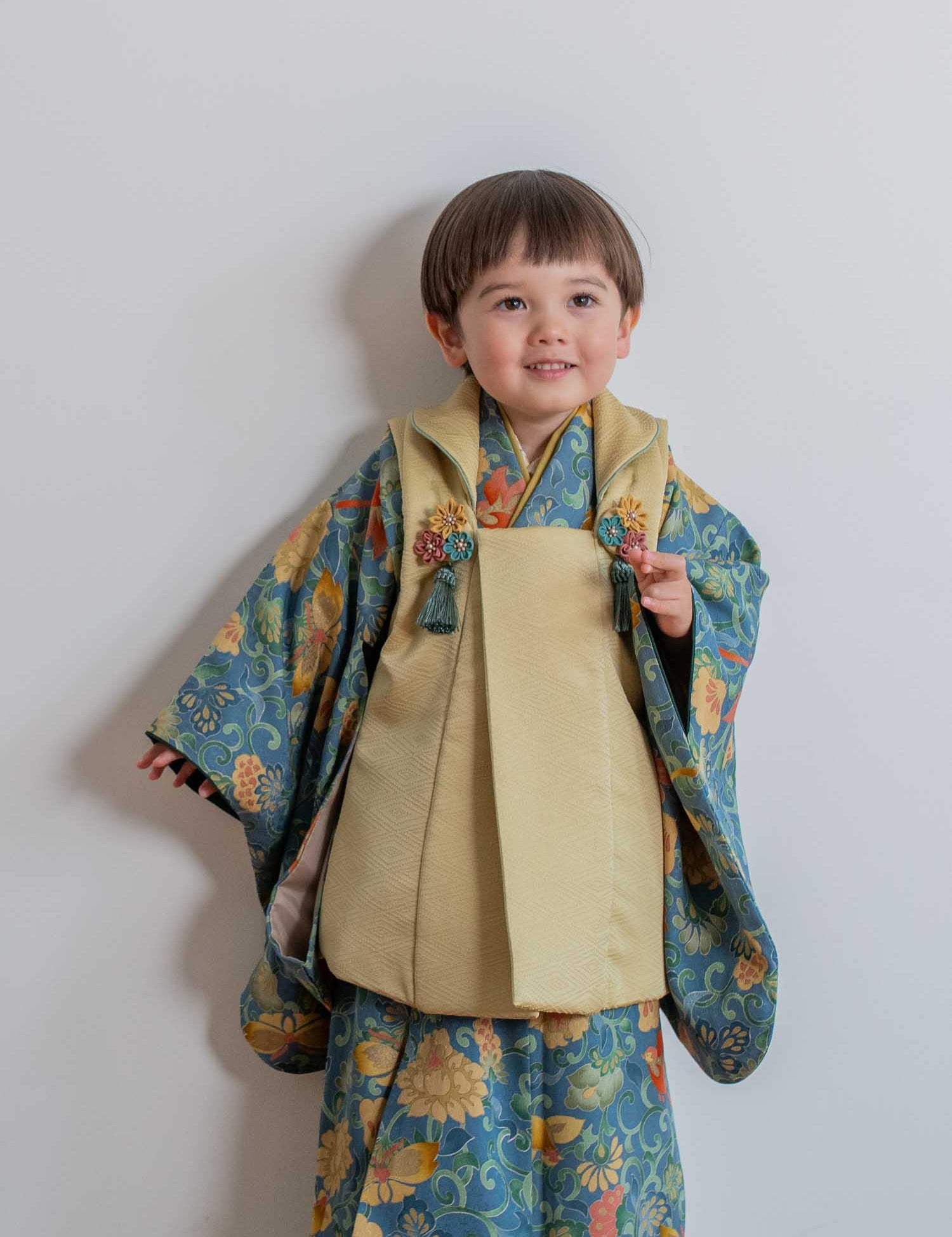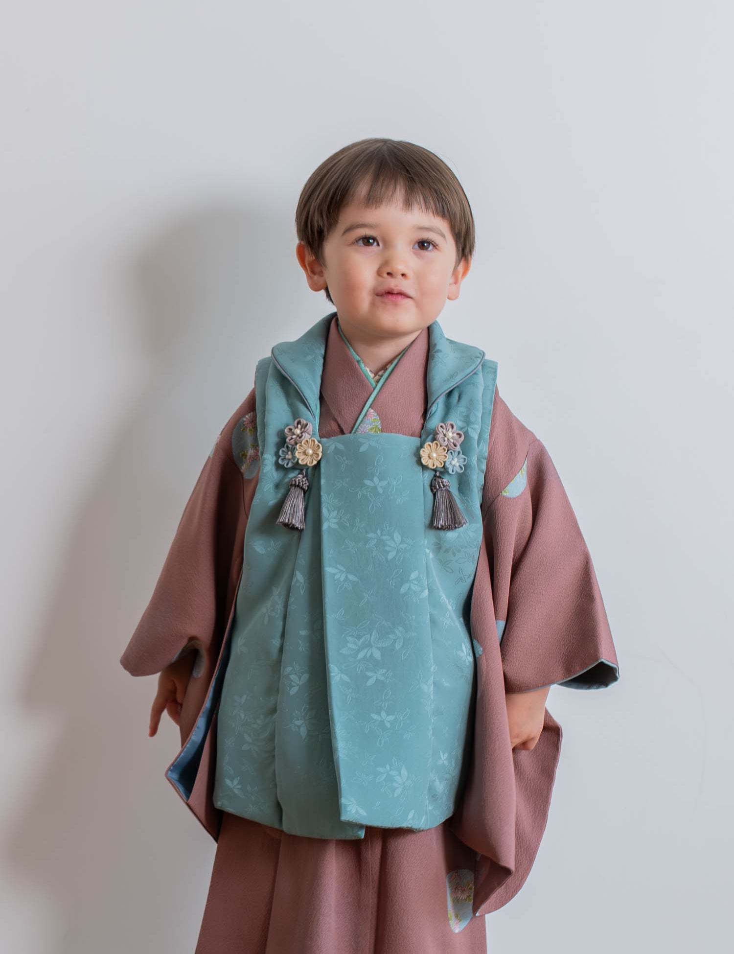 This unique Shichi-Go-San outfit is made by re-tailoring a vintage silk kimono to fit a child, combining traditional and modern elements.