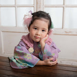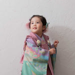 This unique Shichi-Go-San outfit is made by re-tailoring a vintage silk kimono to fit a child, combining traditional and modern elements.