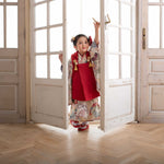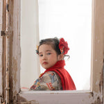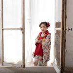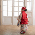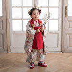 This unique Shichi-Go-San outfit is made by re-tailoring a vintage silk kimono to fit a child, combining traditional and modern elements.