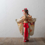 This unique Shichi-Go-San outfit is made by re-tailoring a vintage silk kimono to fit a child, combining traditional and modern elements.