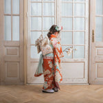 This unique Shichi-Go-San outfit is made by re-tailoring a vintage silk kimono to fit a child, combining traditional and modern elements.