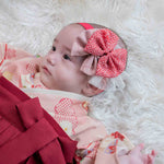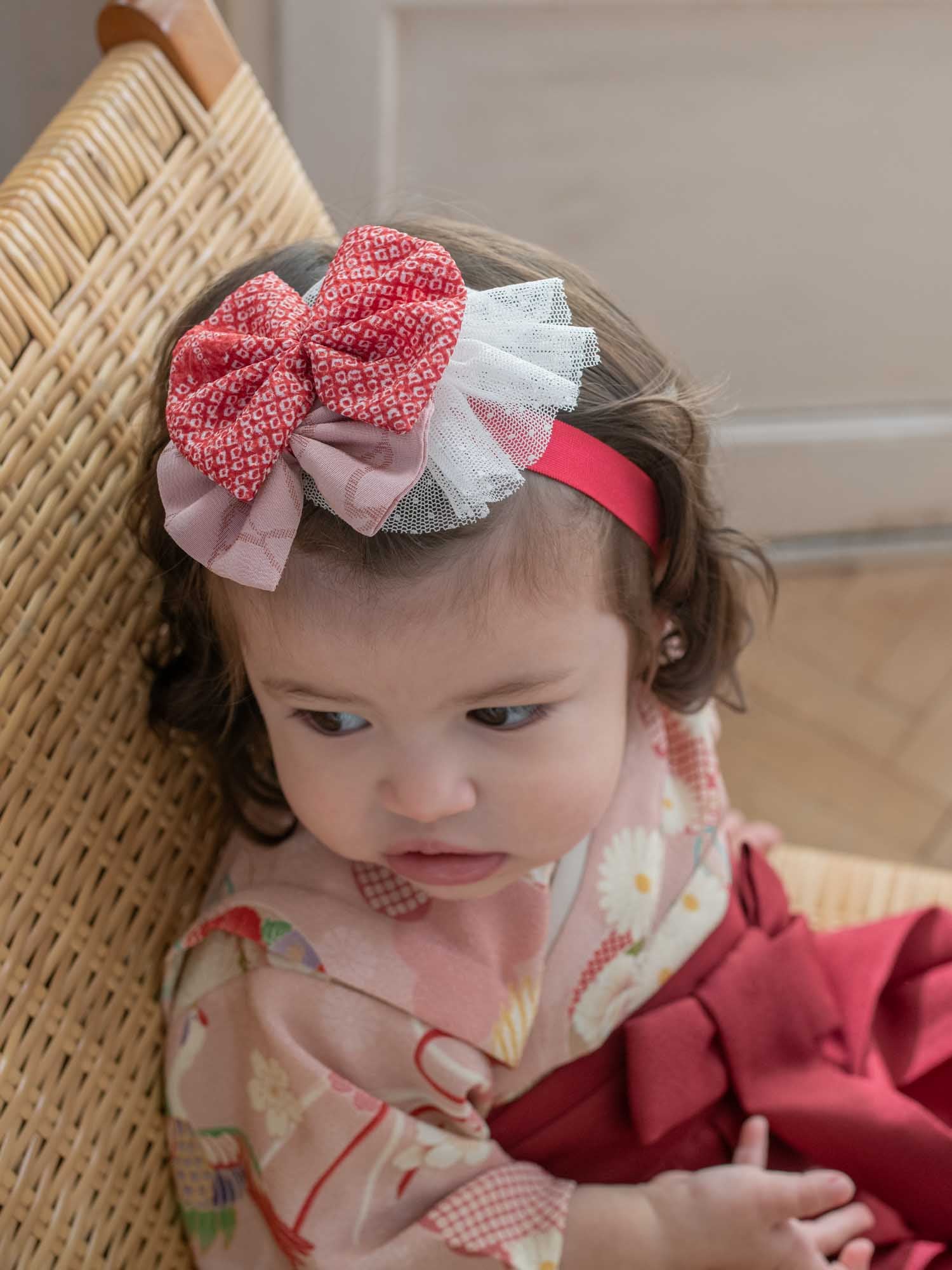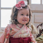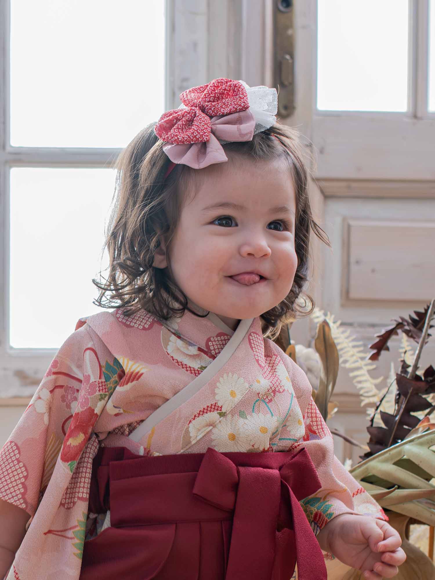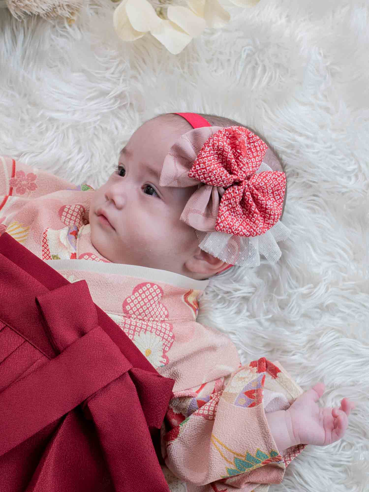 重なり合うリボンが目を引く華やかなデザインで、ベビー袴との相性もぴったり。