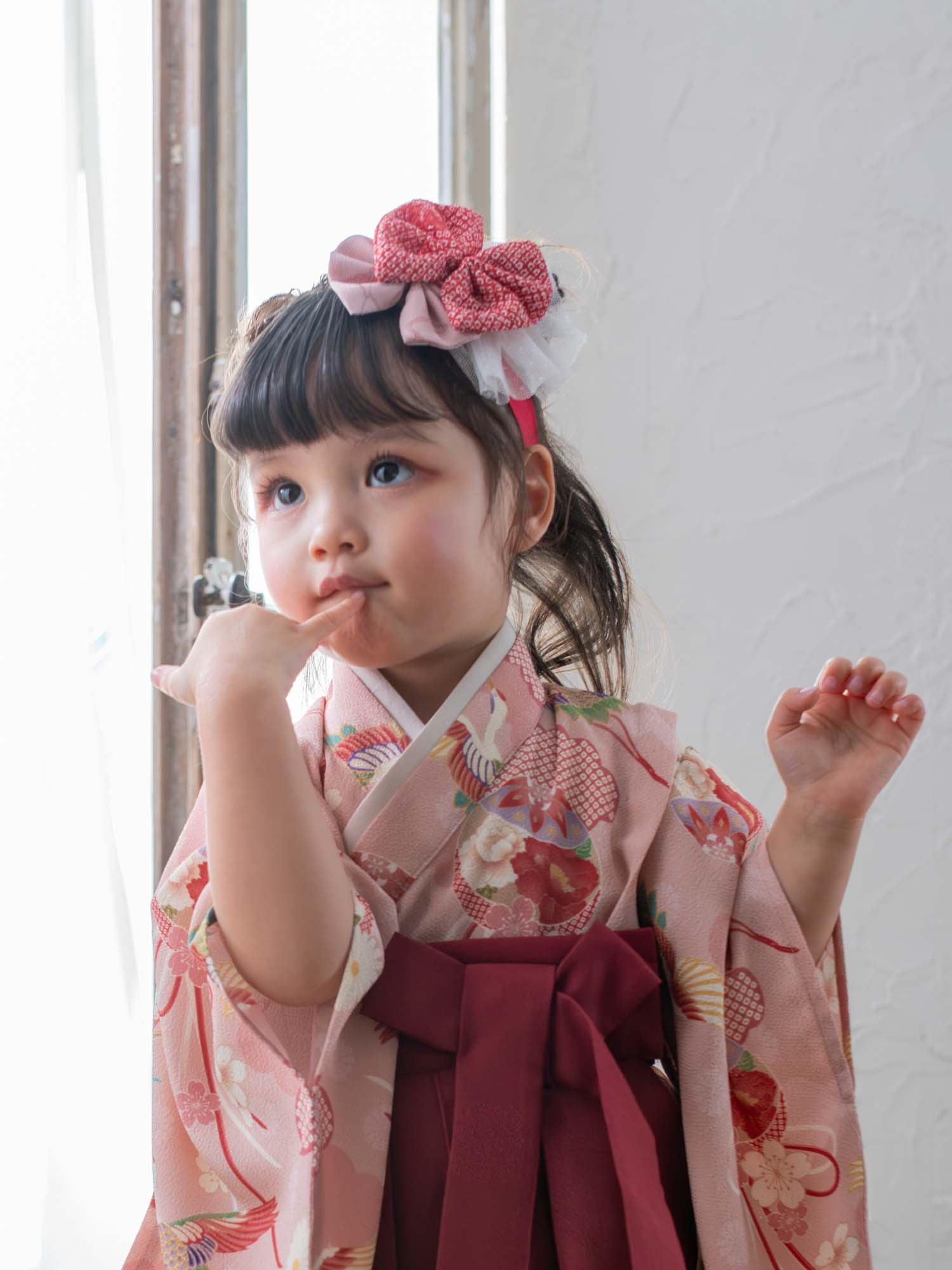 ピンクや赤を基調とした愛らしい色合いで、写真映えのする装いに。
