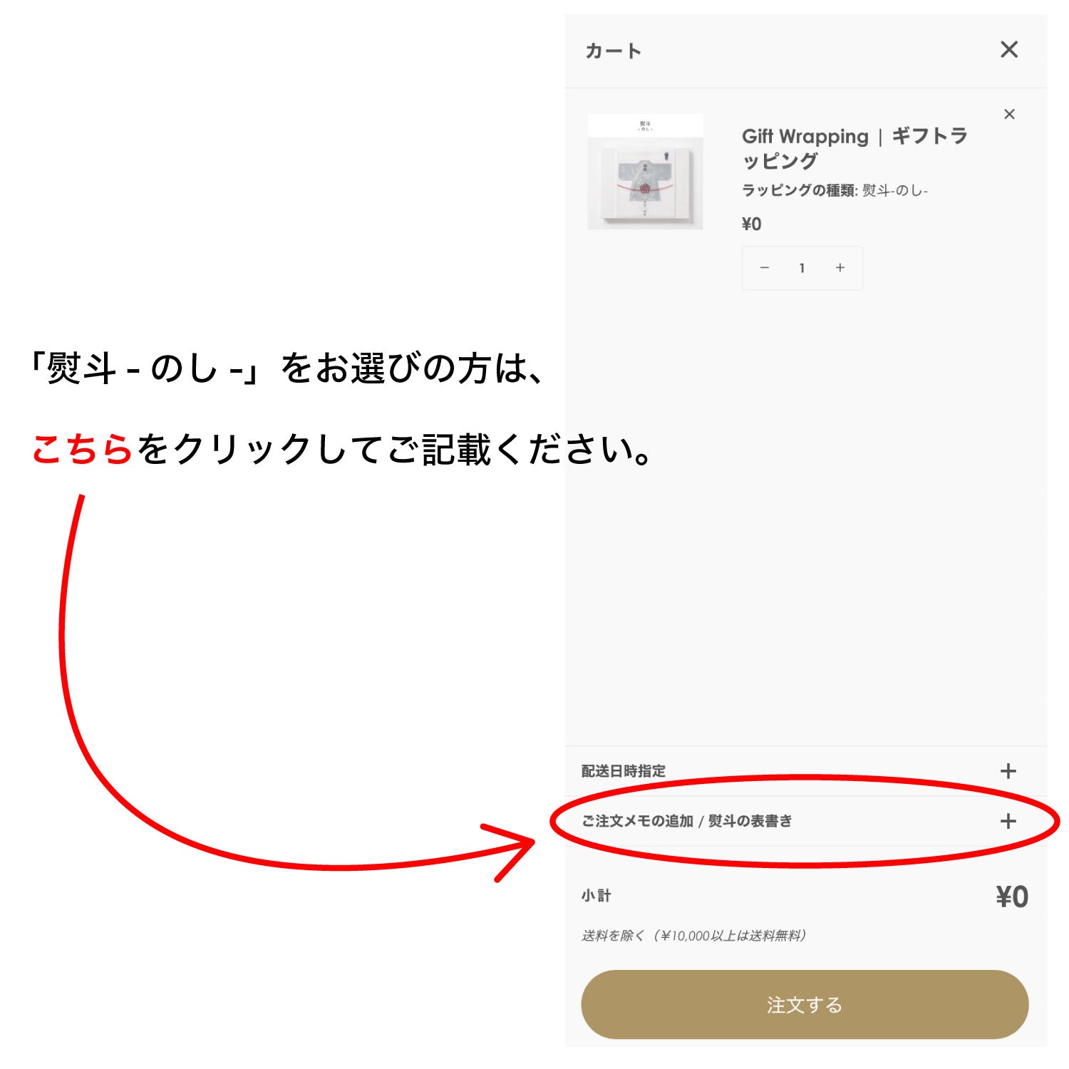 必ずカートページの「ご注文メモの追加/熨斗の表書き」欄に表書き氏名をご記載ください。